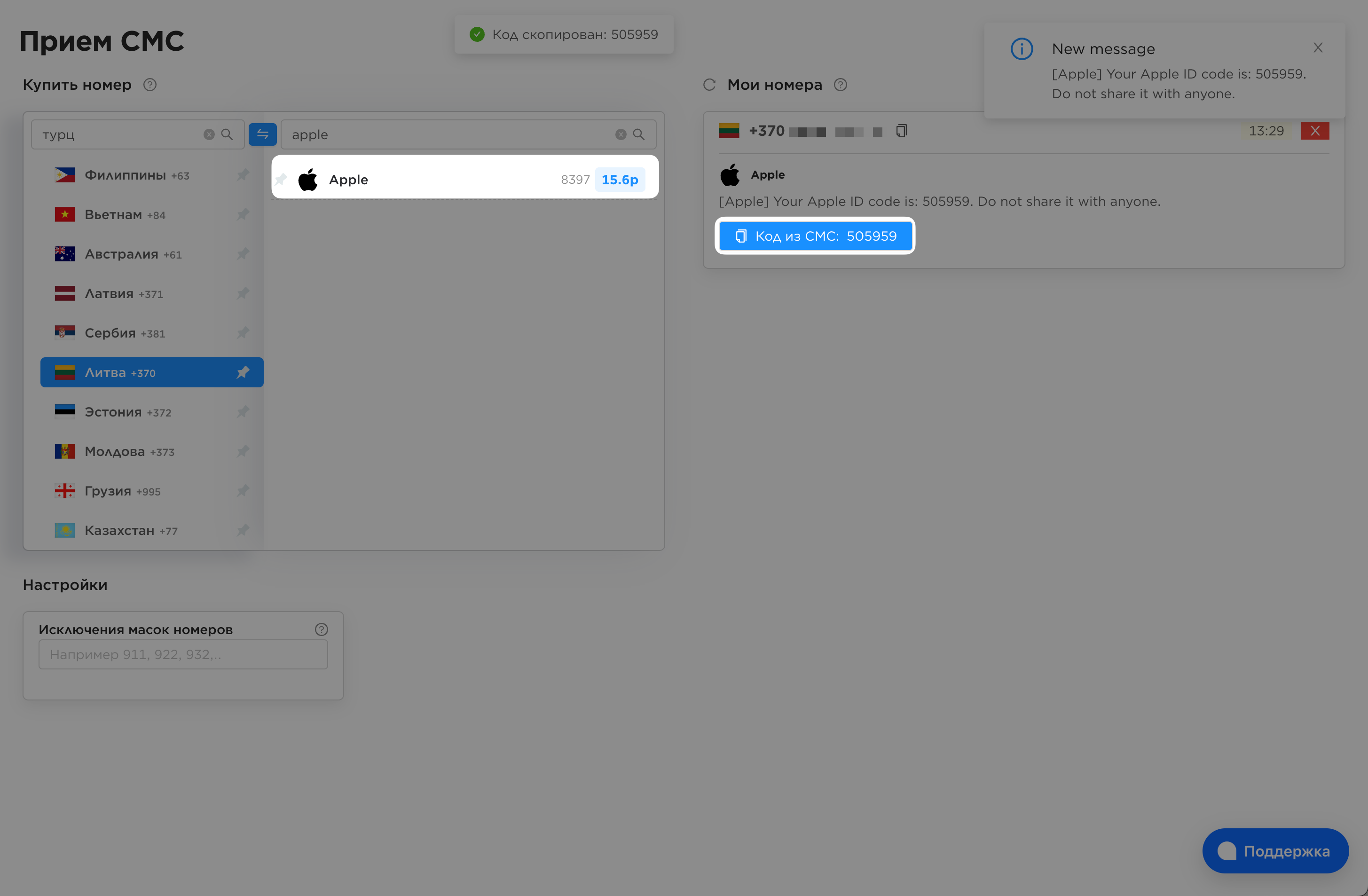 Сервисы виртуальных номеров — это онлайн-платформы, которые дают временный доступ к телефонным номерам разных стран. Вы арендуете номер на 10–20 минут, получаете SMS с кодом от Apple и создаете аккаунт.