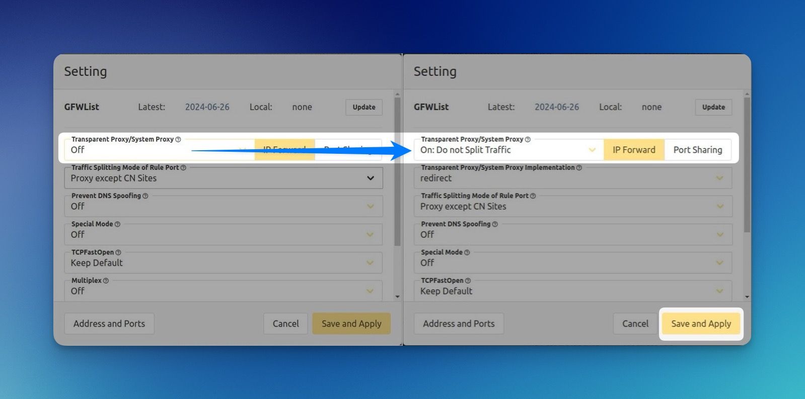 Откройте Setting (Настройка) справа сверху и измените параметр Transparent Proxy/System Proxy (Прозрачный прокси/Системный прокси) c OFF (Выключено) на On: Do not Split Traffic (Включено: не разделять трафик).