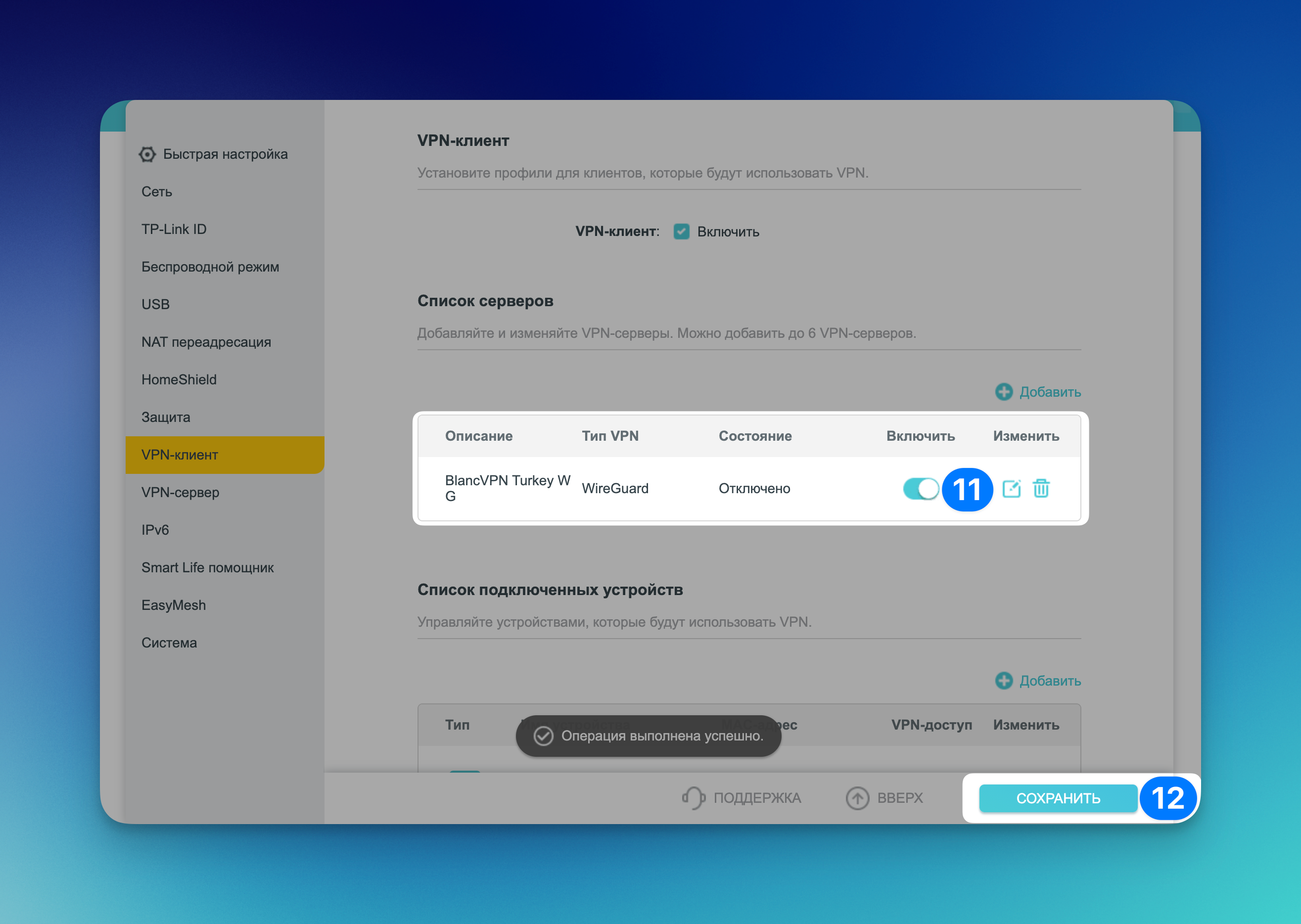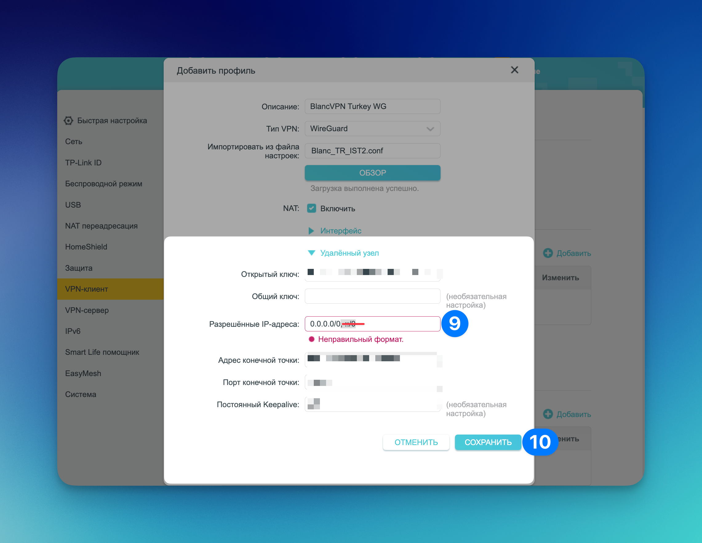 Войдите в личный кабинет. Нажмите Установить → выберите устройство → Другой VPN-клиент → перейдите к инструкции → TP-Link → в графе Локация и протокол выберите WireGuard и локацию → сохраните нужное количество файлов конфигурации .conf.