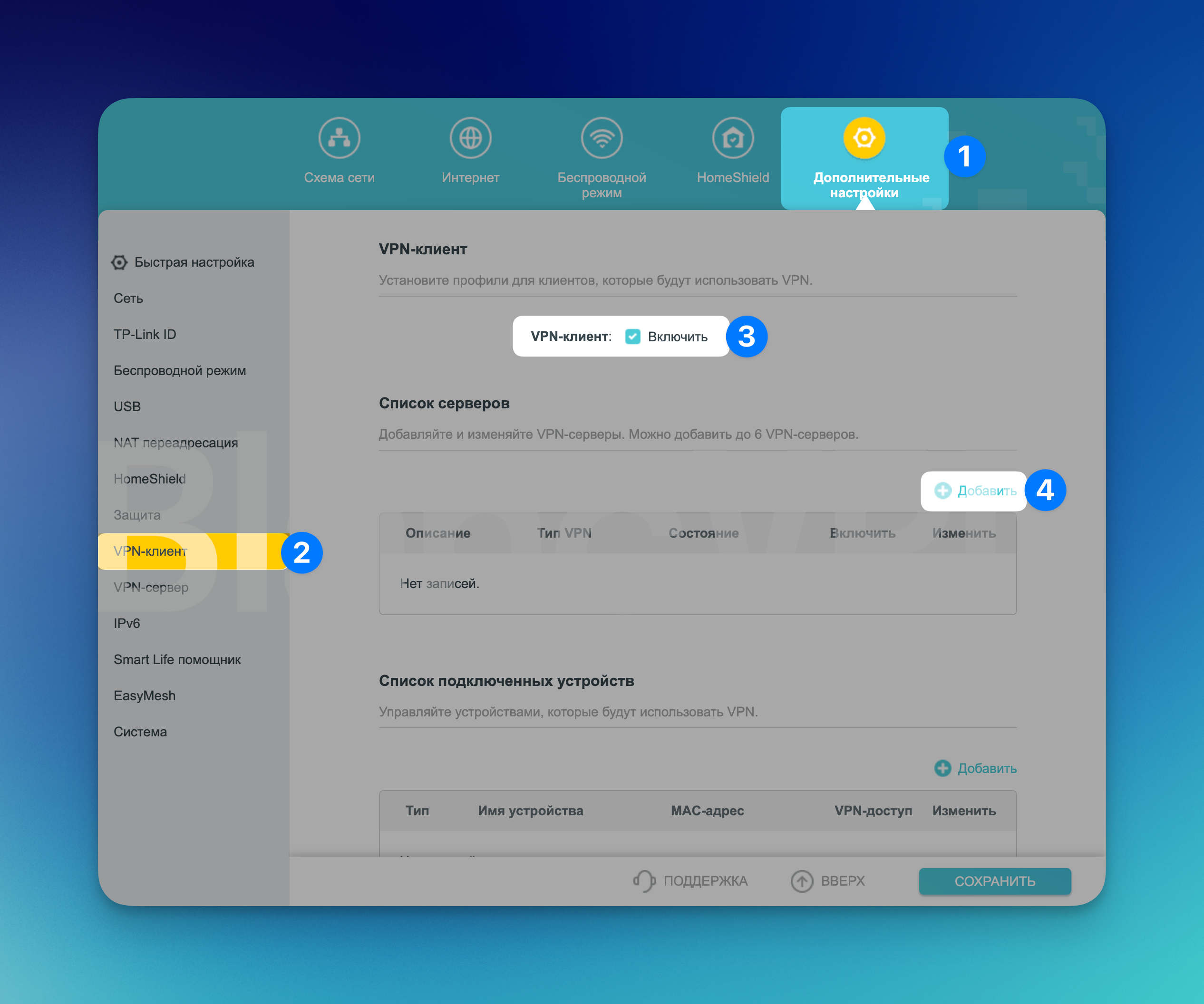 Выберите VPN-клиент. Если его нет, это значит, что ваш маршрутизатор не поддерживает подключение к VPN или прошивка устарела. См. список роутеров TP-Link, на которые можно установить VPN.